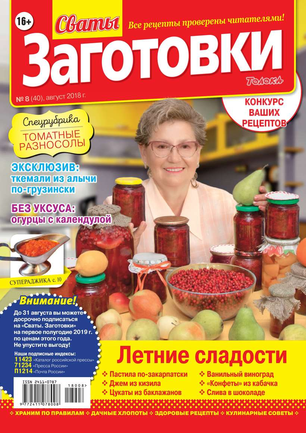Более 100 рецептов заготовок от Сватов в каждом номере: соленья и маринады, салаты и ассорти, соусы и приправы, заготовки к сезону, сладкие заготовки, напитки, винный погребок, мясные деликатесы, здоровые рецепты, целебные заготовки, дачные хлопоты, правила хранения, а также кроссворды и сканворды для досуга. Лучшими рецептами поделятся с вами сваты Любовь Сергеевна и Михаил Михайлович.