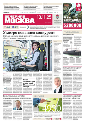 «Вечерняя Москва» — ежедневная российская вечерняя газета, старейшее из вечерних изданий в России, учрежденное в 1923 году. Выходит пять дней в неделю, кроме субботы и воскресенья. Отличается тем, что рассказывает о событиях еще не завершившегося дня. Оперативно освещает хронику и особенности жизни Москвы, охватывает все слои общества и большинство профессиональных и возрастных групп читателей.Издание представлено тремя выпусками – утренним ежедневным, вечерним (выходит три раза в неделю), еженедельным (выходит по четвергам).