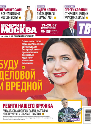 Еженедельный выпуск «Вечерней Москвы» — это значимые события недели, афиша города, новости из сферы отдыха и развлечений, телепрограмма с анонсами и комментариями, авторские колонки журналистов и авторитетные мнения экспертов, детская страничка, специальная рубрика «Золушка», интересные репортажи о необычных судьбах московских жителей, постоянные конкурсы и викторины.