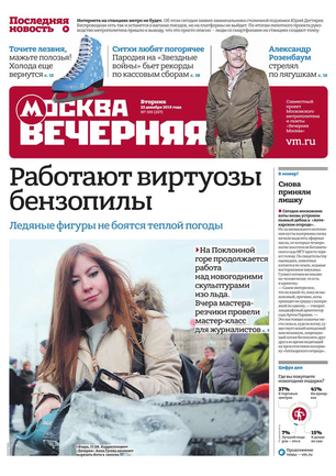 «Вечерняя Москва» — ежедневная российская вечерняя газета, старейшее из вечерних изданий в России, учрежденное в 1923 году. Выходит пять дней в неделю, кроме субботы и воскресенья. Отличается тем, что рассказывает о событиях еще не завершившегося дня. Оперативно освещает хронику и особенности жизни Москвы, охватывает все слои общества и большинство профессиональных и возрастных групп читателей.Издание представлено тремя выпусками – утренним ежедневным, вечерним (выходит три раза в неделю), еженедельным (выходит по четвергам).